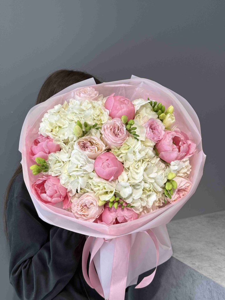 Skład bukietu: hortensja, róża, piwonia, frezja.